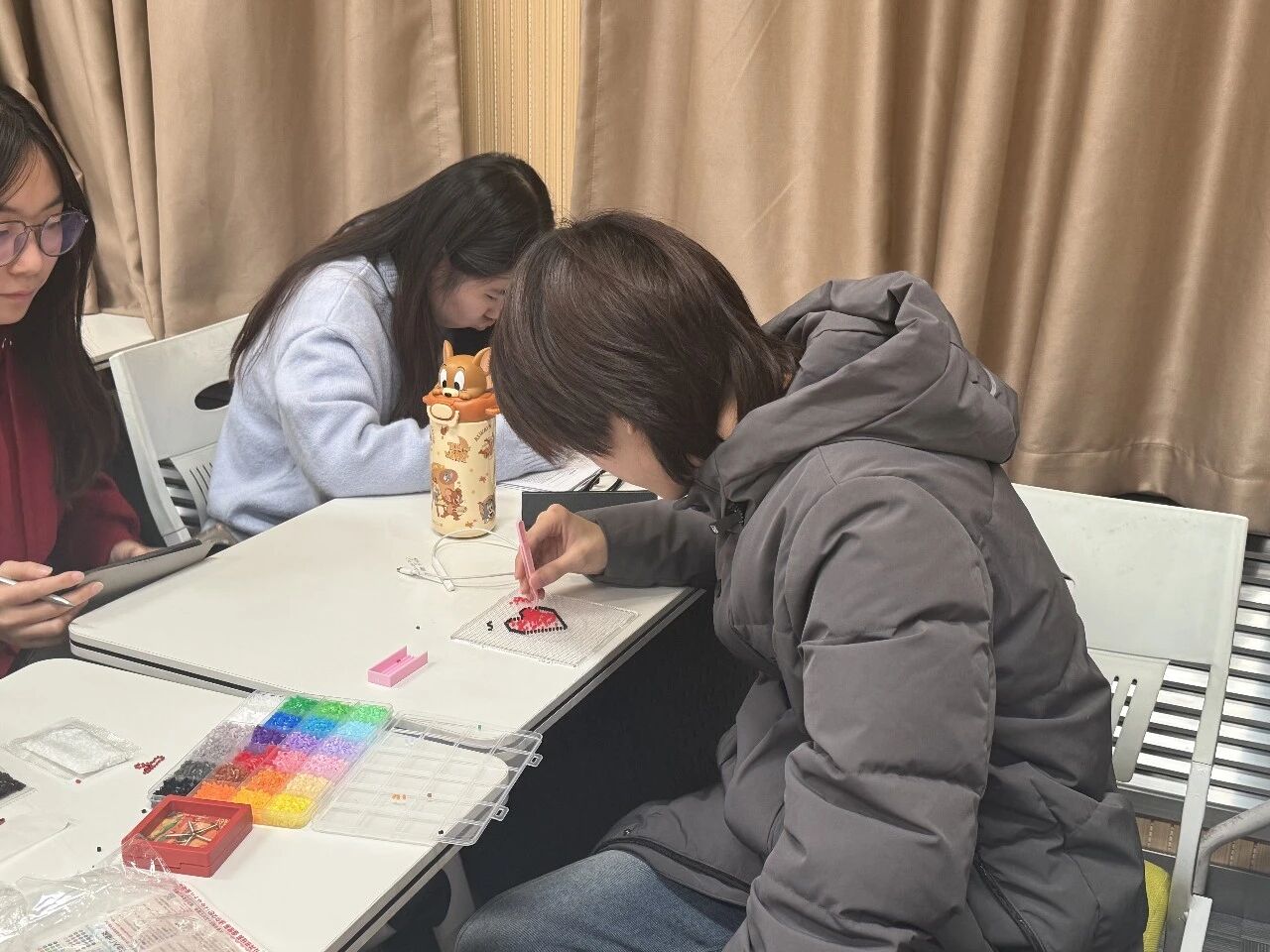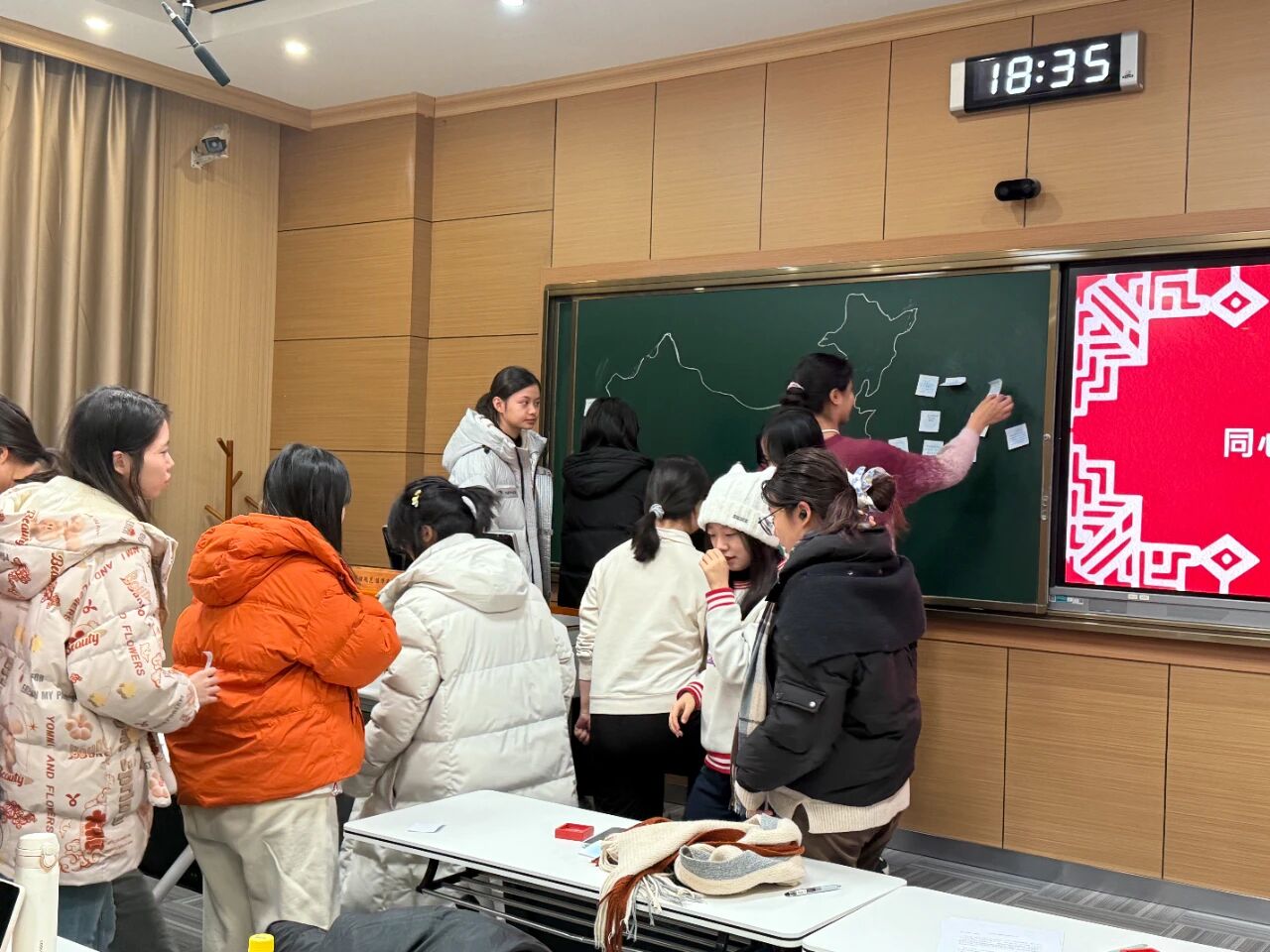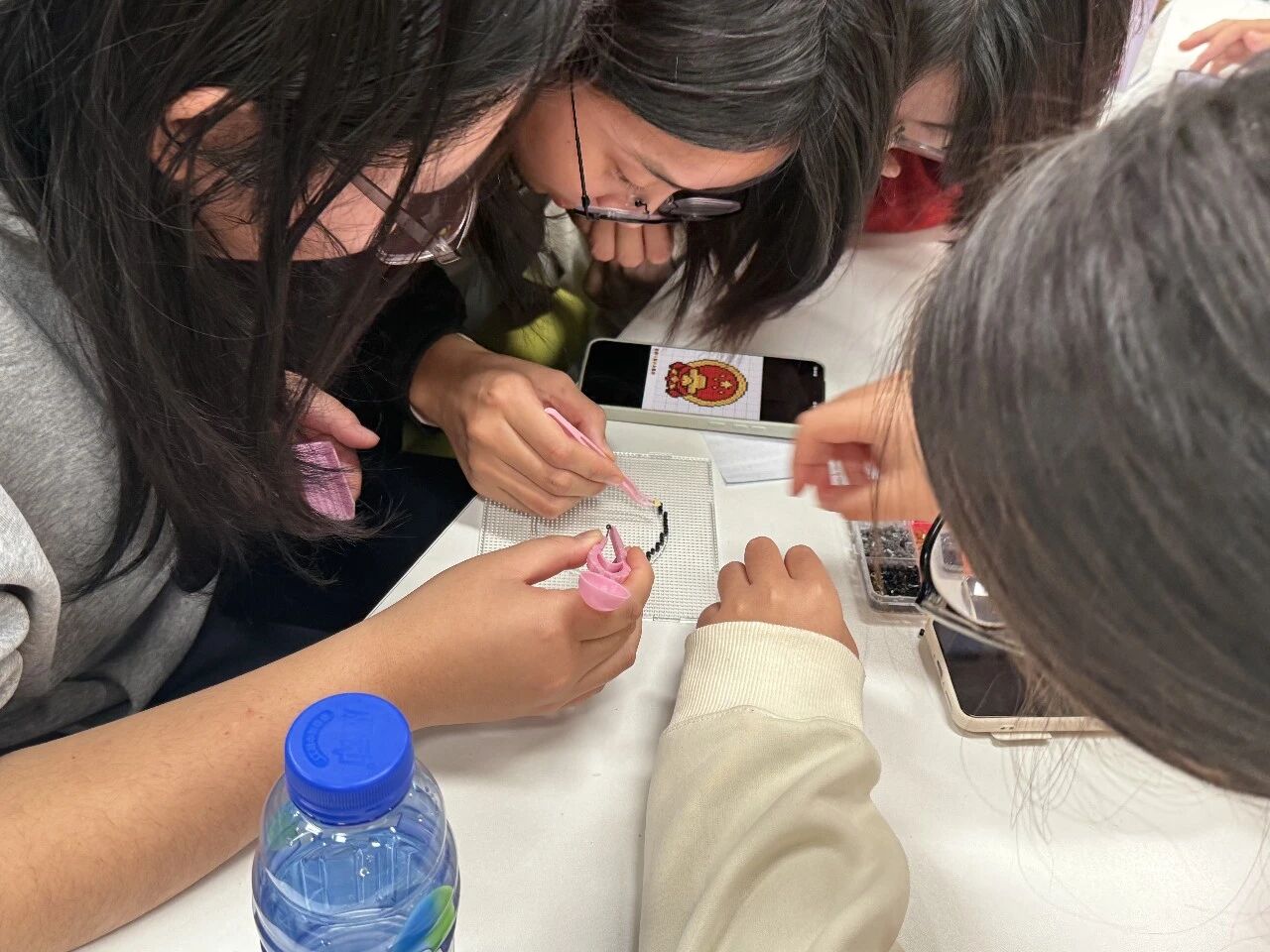 尾声环节,“青春向党·强国有我”寄语墙前,同学们写下对祖国的祝福与报国志向;“我与祖国同在”拼豆活动里,各小组用拼豆DIY出青春形象并粘贴在“祖国版图”上,以创意形式诠释“以小我筑大我”的信念。