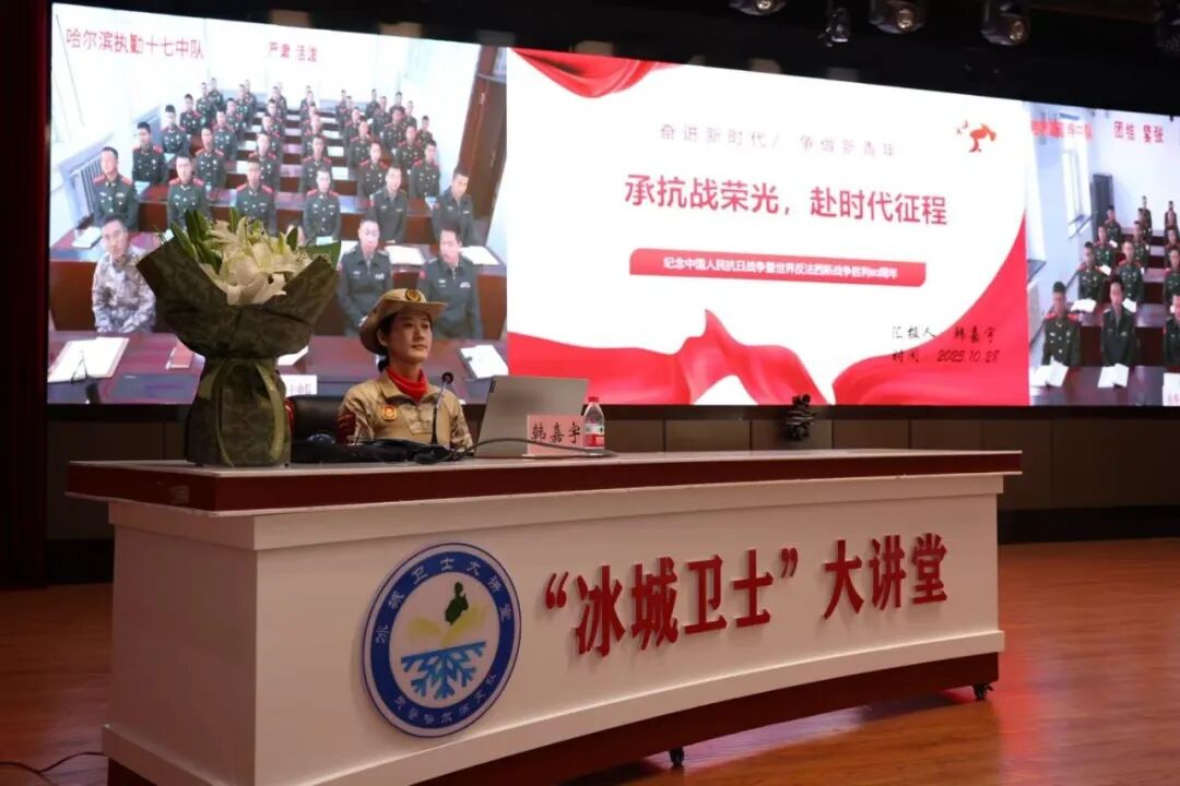 “冰城卫士”大讲堂上,韩嘉宇同学以“承抗战荣光,赴时代征程”为主题,动情讲述了参加“九·三阅兵”背后的拼搏历程与心路感悟。心中有信仰,脚下有力量。她讲道:“经过这段脱胎换骨式的艰苦训练,皮肤晒黑了,但忠诚底色更加鲜亮;身体消瘦了,但精神脊梁更加挺拔。”她以真挚的语言、饱满的情感,再现了阅兵场上的庄严时刻与军人使命,深深感染了在场的每一位武警战士,现场掌声不断。