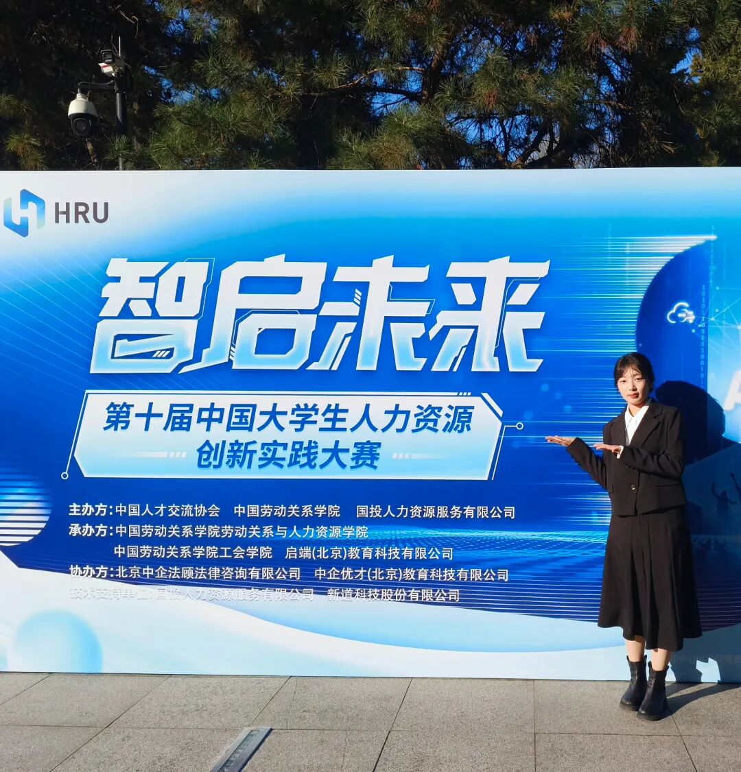 “劳动争议处理”赛道的于欣平同学获得一等奖。围绕“ 临近退休年龄劳动者工伤后的一次性伤残就业补助金赔付数额”这一争议案例,她调动《工伤保险条例》等相关知识储备,系统梳理案情并精准定位法条,最后从HR角度给出专业的解决方案。她在竞赛中展现出的法律功底与专业素养,赢得评委的高度认可。