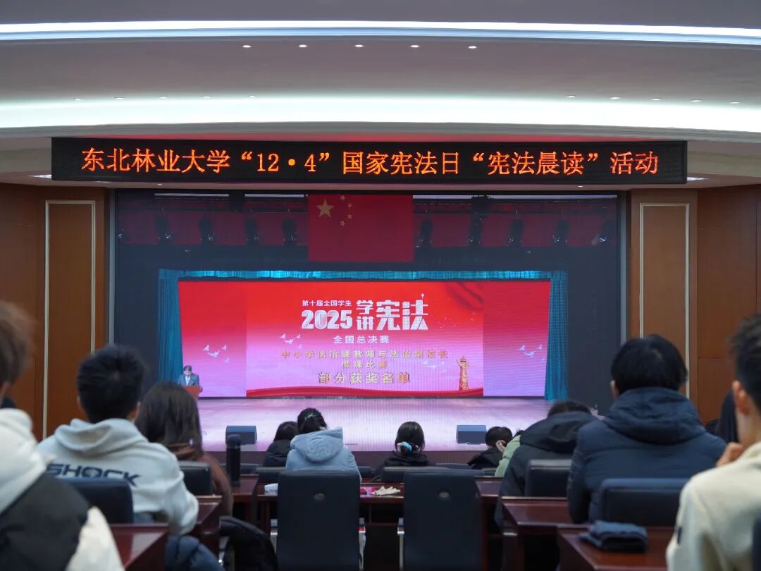12月4日清晨,晨光熹微,东北林业大学动保楼内庄严肃穆,宪法晨读活动在此如期举行。师生们齐聚一堂,齐声诵读宪法条文,字字铿锵有力、句句饱含深情,在庄重的仪式感中感受宪法的威严与力量,深切体悟宪法作为根本大法的神圣地位,进一步坚定了遵宪学宪守法用法的法治信仰。