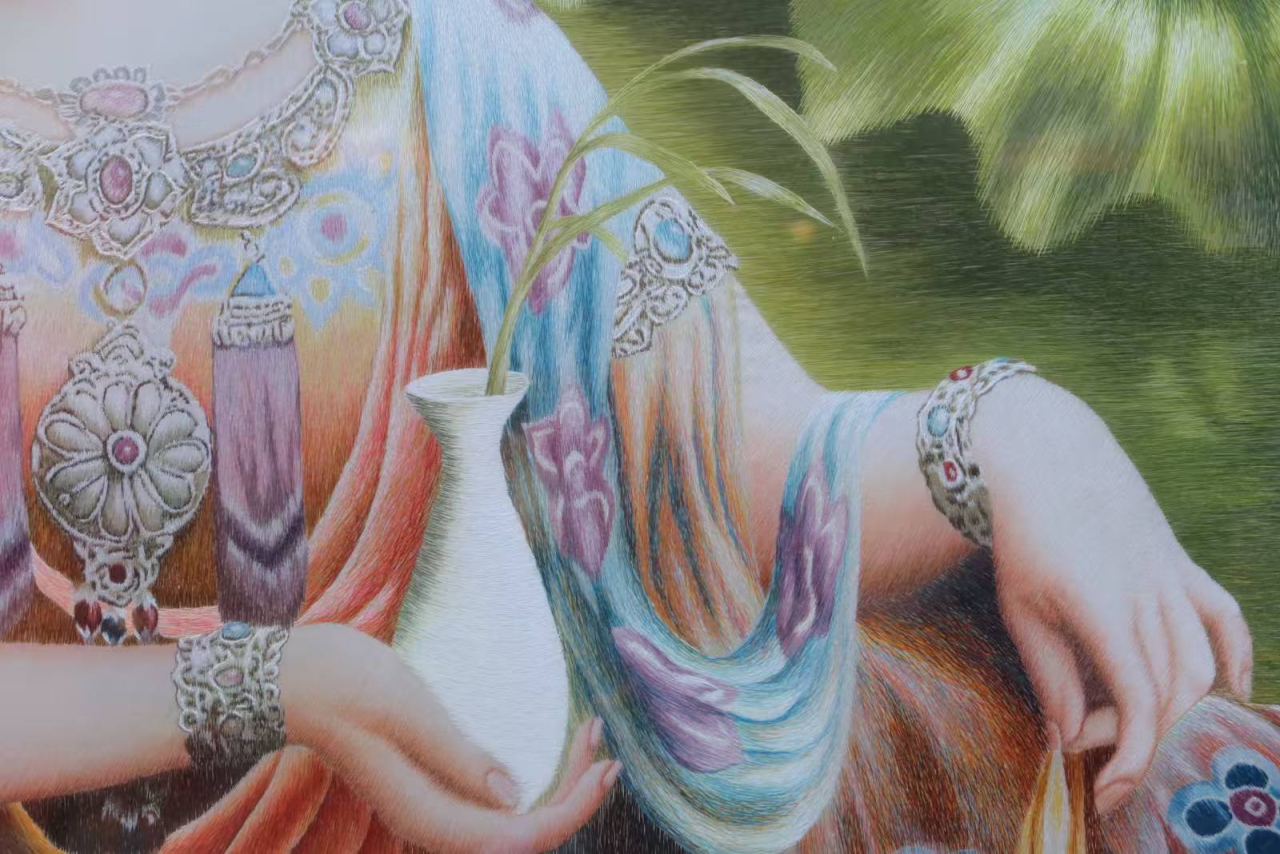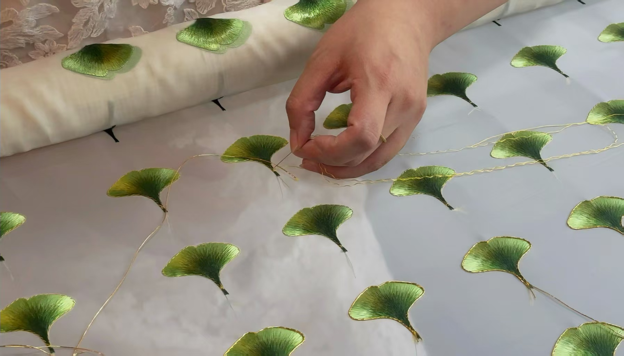 而靺鞨绣的独特质感,则源于东北特产的柞蚕丝。与细腻的桑蚕丝不同,柞蚕丝质地密实、折光面积大,具有天然的光折射特性。这种材料特性与东北自然环境深度契合,可谓独属于北方的馈赠。