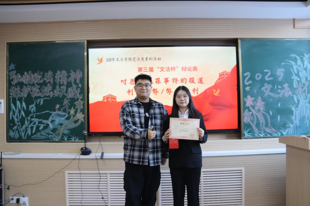 通过此次辩论赛,不仅锻炼了同学们的思辨能力和语言表达能力,更激发了大家对法治社会建设的关注与热情。辩手们在赛场上的精彩表现,充分展示了文法学院学子扎实的专业素养和积极向上的精神风貌。同时,本次辩论赛也为不同专业的学生提供了一个交流与学习的平台,促进了学科之间的融合与碰撞。相信在未来的学习和生活中,同学们会带着这份对法治的热爱与追求,不断探索前行,为推动法治社会的进步贡献自己的力量。