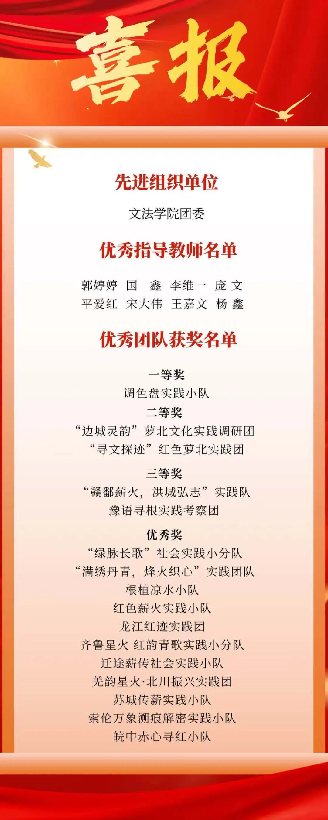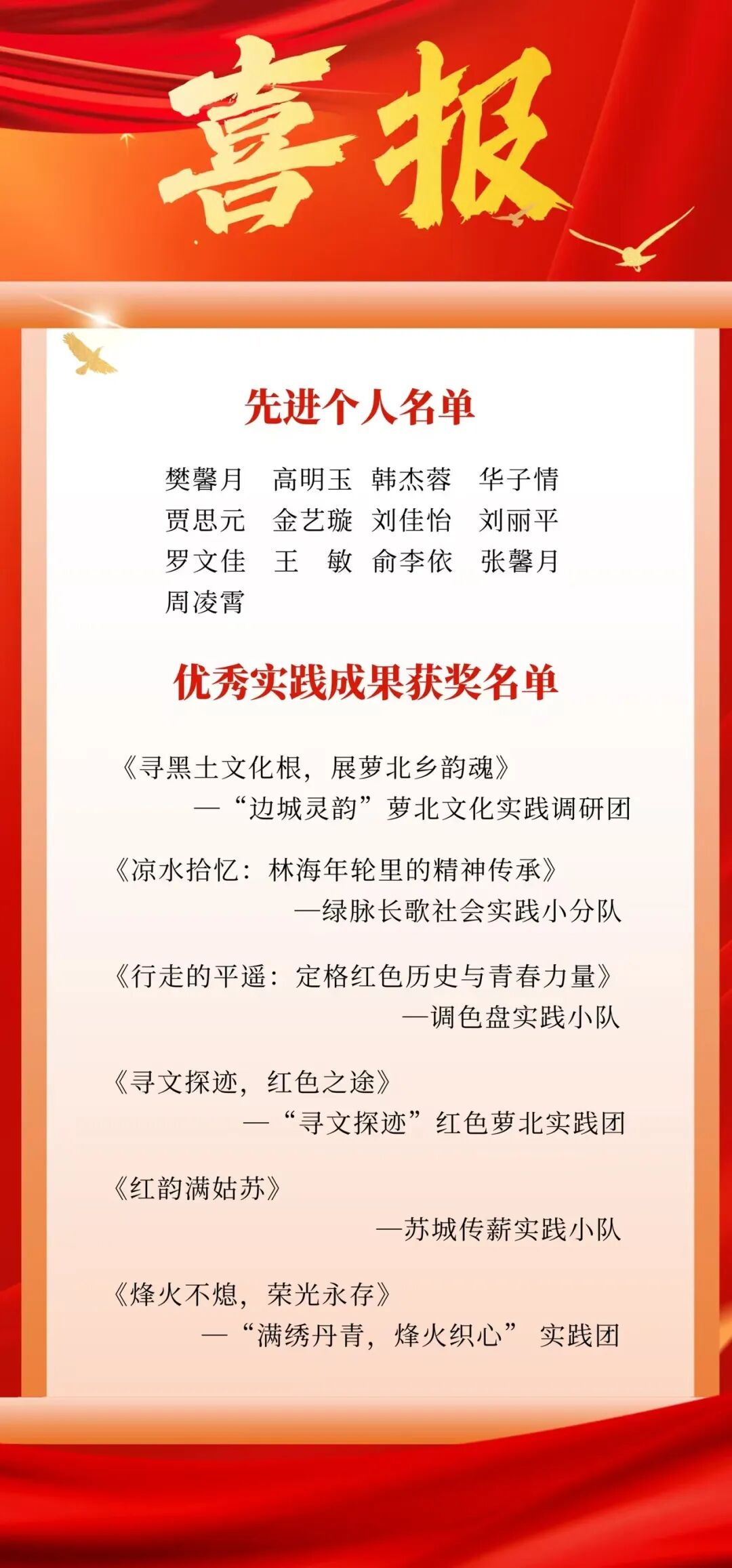凭借扎实的组织工作成效与丰厚的实践收获,文法学院团委交出亮眼答卷,在本次暑期实践中,荣获“先进组织单位”荣誉称号,13名学子获评“社会实践先进个人”,共6项作品获评“优秀实践成果”,这是文法青年争做先锋、勇担重任的深刻写照。